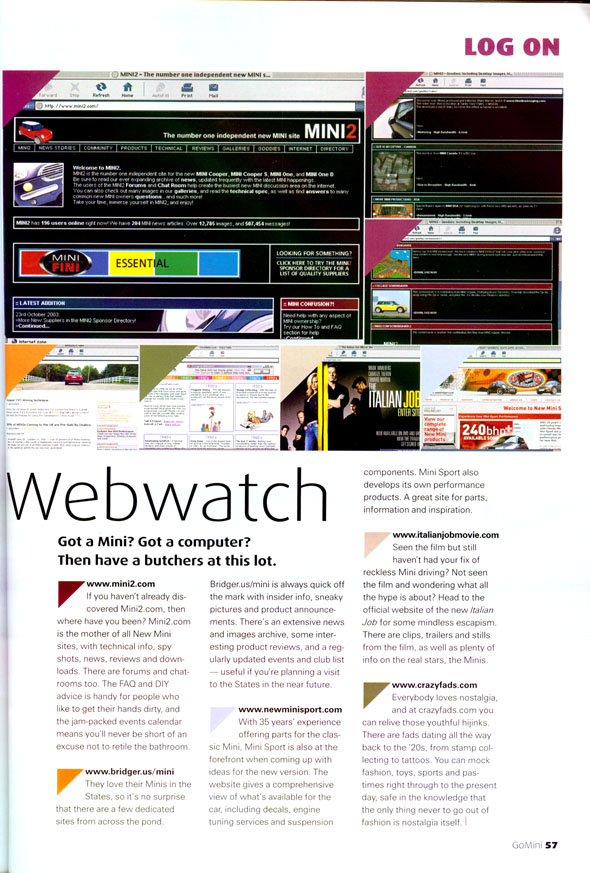 If you're lucky enough to get your hands on the copy of GoMINI, the new bi-monthly MINI magazine, be sure to check out the “Log On” section. There you'll find a handful of screenshots and reviews of some of the better sites on the web dedicated to MINIs. I'm proud to say that this site is one of those featured. See what they had to say:
